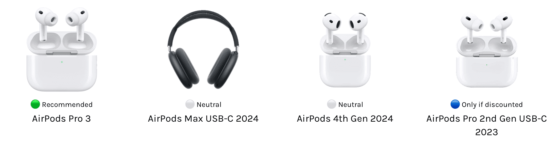 AirPods Max (2024 with USB-C): Premium over-ear headphones with top-tier ANC, high-fidelity sound, and a distinctive mesh canopy + stainless steel build. The latest update adds USB-C charging, wired lossless support, and new colors.